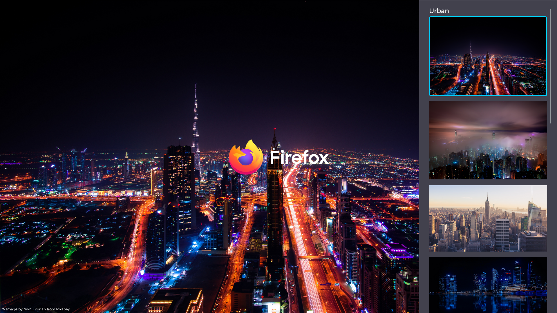 newTab is a Firefox extension that changes the appearance of the new tab page. It has a simple design with just a Firefox logo and text in the center of the screen, and a solid colour background. There is a side menu that can be accessed by clicking the settings icon in the top right corner. From the menu, you can choose from a variety of backgrounds to use as your new tab background. Just click on one of the options to set it as your background. If you want to go back to the solid colour background, simply click on the selected image again to deselect it. All the photos have credits in the bottom left corner.